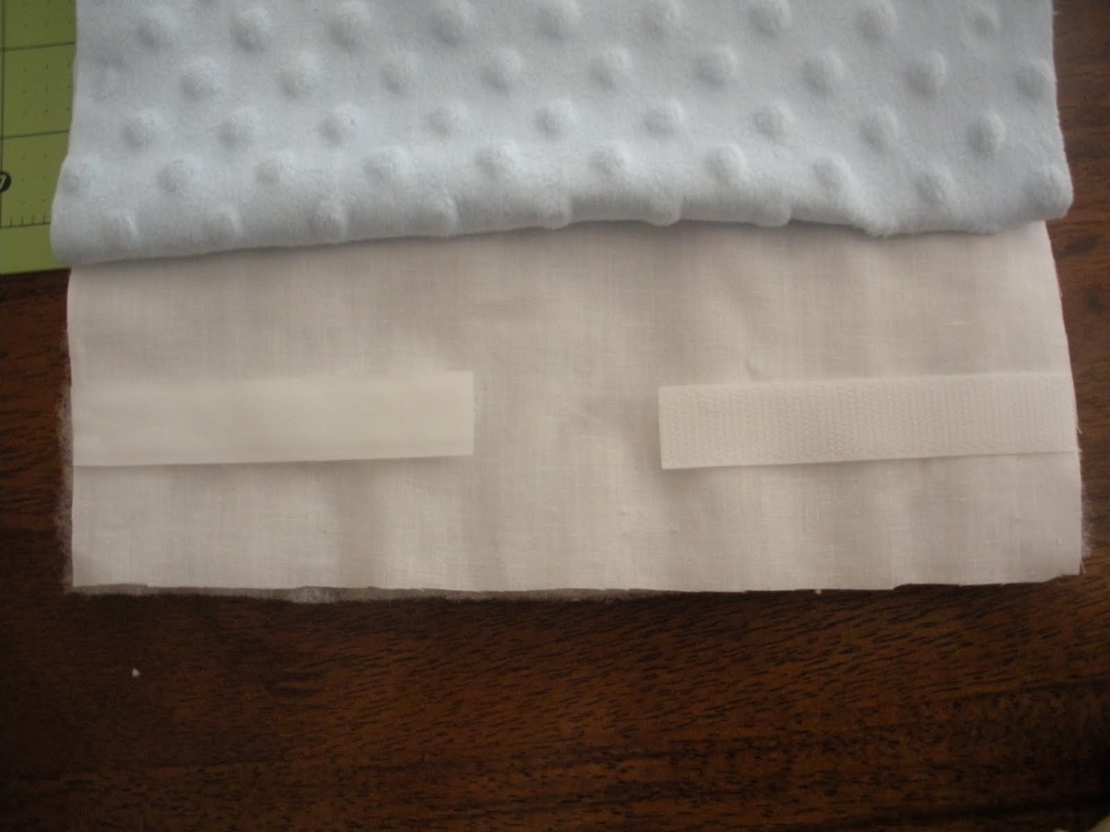 You will tuck each piece in the middle of the minky and cotton. Pin in to place. I placed mine starting in the center and then the ends about 1" from the sides.